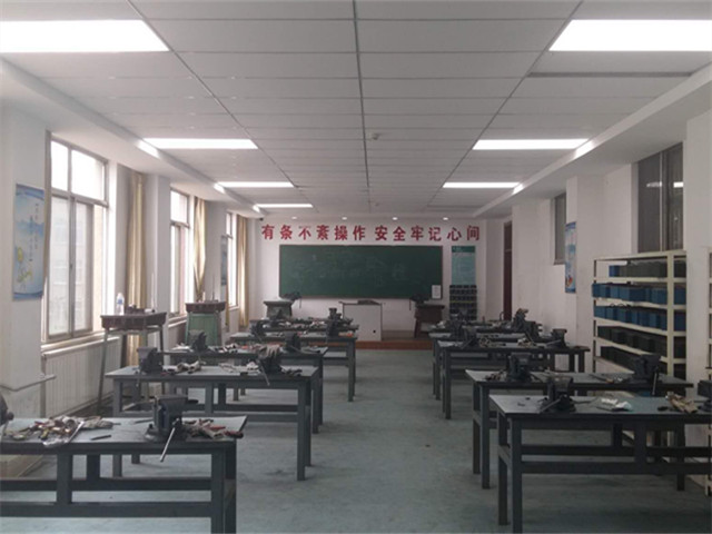 该实训室位于泰安校区实习楼208-210,使用面积约280平方米,现有台虎钳30台、划线平台7个,可同时容纳30人同时进行钳工实习。该实训室可承担学校所有专业和层次学生的金工实习课程中的钳工基础训练项目和综合技能训练项目。通过实习使学生了解钳工在工业生产中的地位,掌握钳工基本操作技巧、常用钳工工具、量具、设备的使用方法,掌握中等复杂零件钳工加工工艺的编制,培养良好的劳动生产纪律和安全意识。
