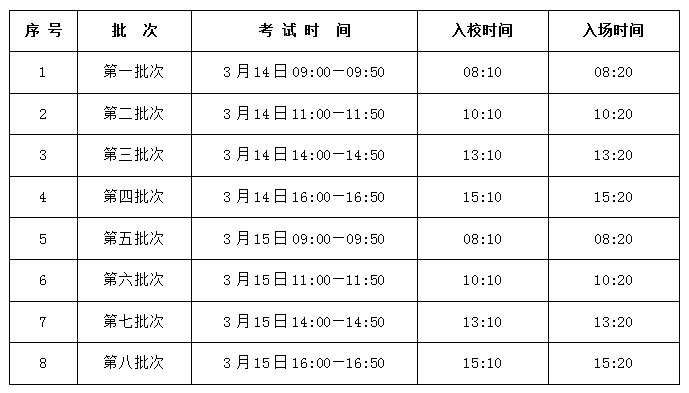 3.考生入场及考试过程中需携带的物品详见《准考证》考生须知。考生进入学校3号门时,除《准考证》考生须知里指定的考试自备物品,其余物品严禁带入,考生手机等个人物品应交给随行人员妥善保管(不同批次考试的入场时间见附件)。考点按要求配置了两次安检设备,检查过程可能要求考生打开文具袋、亮出衣服口袋物品、脱帽检查等,请务必理解和配合。